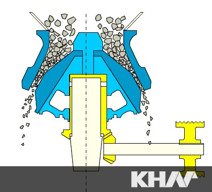 單缸液壓圓錐破碎機(jī)工作時(shí),電機(jī)通過皮帶輪和三角帶帶動(dòng)設(shè)備傳動(dòng)軸轉(zhuǎn)動(dòng),傳動(dòng)軸通過大小錐齒輪帶動(dòng)偏心套轉(zhuǎn)動(dòng),動(dòng)錐通過主軸在偏心套作用下做旋擺運(yùn)動(dòng),使動(dòng)錐和定錐時(shí)而靠近、時(shí)而遠(yuǎn)離軋臼壁,物料在軋臼壁和破碎機(jī)之間的破碎腔內(nèi)不斷受到擠壓、沖擊而破碎,破碎的物料從下部排出。