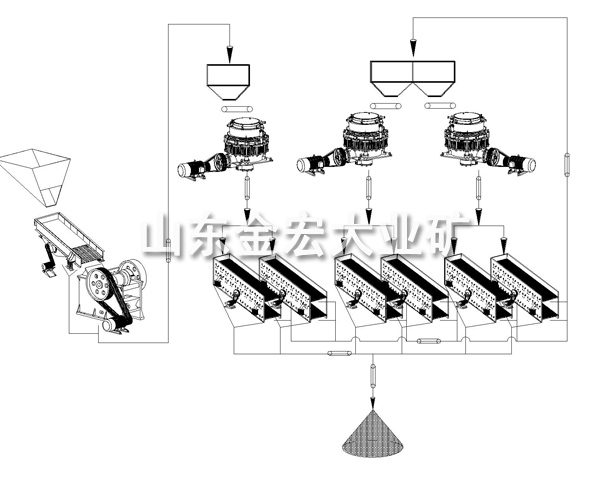 1.大塊的銅礦石經(jīng)料倉由振動(dòng)給料機(jī)均勻地送進(jìn)鄂式破碎機(jī)或移動(dòng)顎式破碎站(初破)進(jìn)行粗碎;粗碎后的銅礦石經(jīng)過振動(dòng)篩篩分后,由皮帶輸送機(jī)送到單缸液壓圓錐式破碎機(jī)(二破)進(jìn)行中碎;中碎后的銅礦石物料送入多缸液壓圓錐式破碎機(jī)進(jìn)行細(xì)碎。